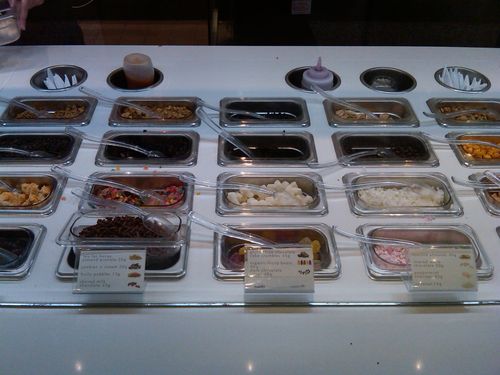 For toppings, I'll take yogurt chips, kiwi slices and just a spoonful of embarassment