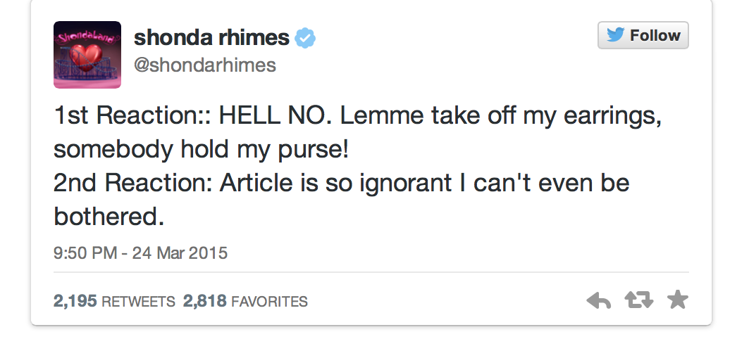And sure, people are upset with the fact that a white lady is screaming “reverse racism” because like 5 shows have minority leads. Yeah, people are bugged that she’s intimating that black actors aren’t as talented as white actors. And folks are annoyed that Andreeva is OK with the fact that there has always been a larger percentage of white people on TV than there are in the actual population, but it freaks her out when it’s the other way around.